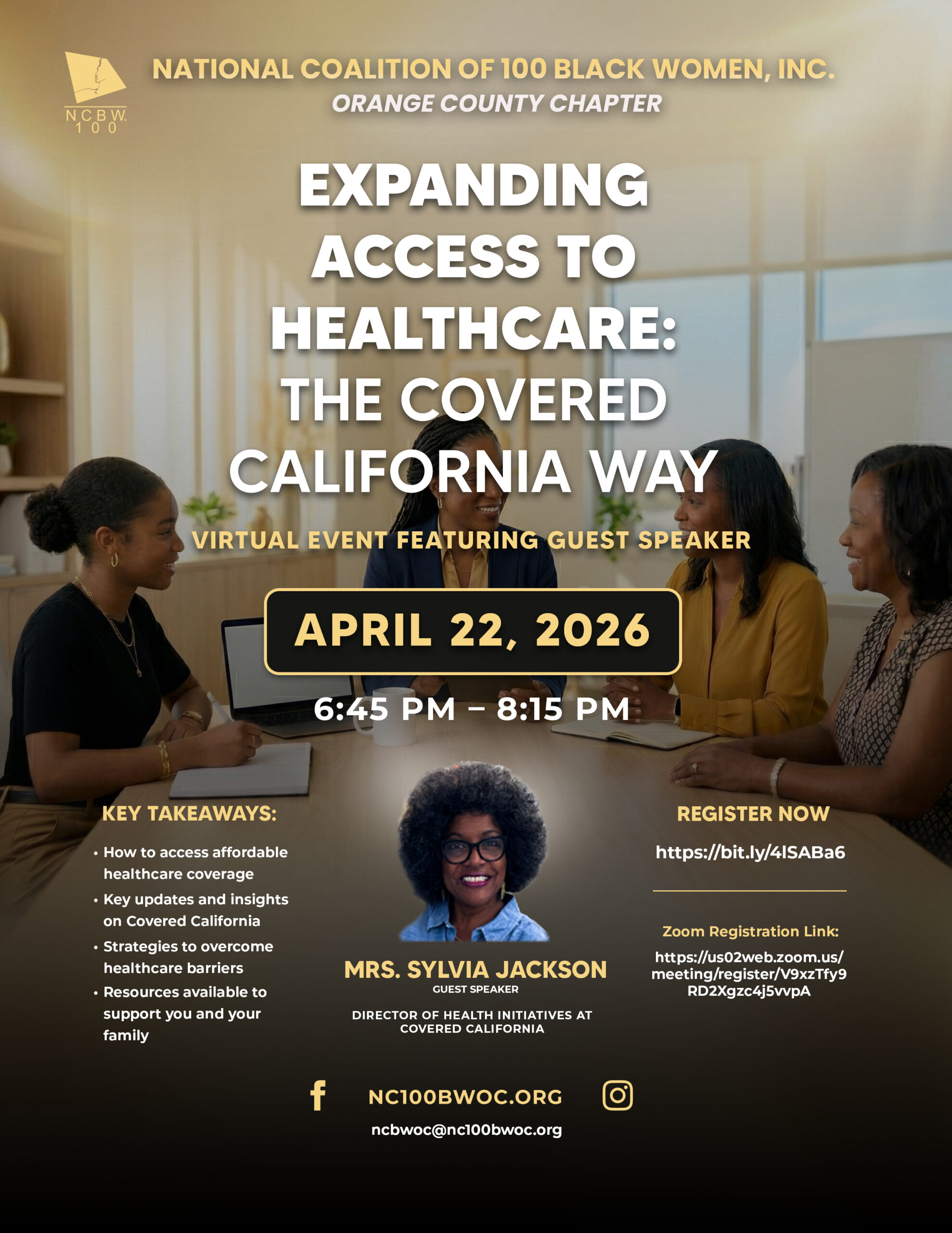 “The Orange County Chapter of The National Coalition of 100 Black Women, Inc.(NCBWOC), remains steadfast in commitment to prioritize the delivery of quality community programs, focusing specifically in the following areas of Health, Education, Economic Empowerment and Public Policy.“